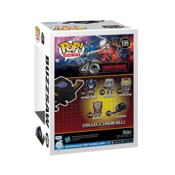 Transform your collection with Pop! Laserbeak!Help this villainous minion regroup with the other Decepticons in your Transformers: Generation 1 set so he can defeat the Autobots!There's a 1 in 6 chance you may find the chase of Pop! Buzzsaw!Vinyl figure is approximately 3-inches tall.Chase variants are shipped at random.Receiving a chase with purchase is not guaranteed.