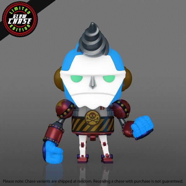 Round out the scurvy crew of the Straw Hat Pirates with this exclusive Pop! General Franky!Give this robot a place to drop anchor when you welcome him to your One Piece collection.There's a 1 in 6 chance you may find the glow-in-the-dark chase of Pop! General Franky.Vinyl figure is approximately 4.5-inches tall.Chase variants are shipped at random.Receiving a chase with purchase is not guaranteed.