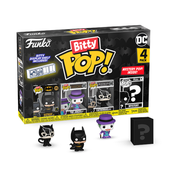 Your favorite Pops! have been shrunk into Bitty Pops!Expand your DC collection with this assortment of Bitty Pop! figures featuring your most beloved heroes and villains!This 4-pack includes Bitty Pop! Batman - 1989, Bitty Pop! The Joker - Batman 1989, Bitty Pop! Catwoman - Batman Returns, and a mystery Bitty Pop! figure.The possible mystery Bitty Pops! are Hyper Rare (1/6) Batman - Justice League, Hyper Rare (1/6) Batman - Batman v Superman, Rare (1/3) The Joker - Batman 1989 (Makeup), and Rare (1/3) Mr. Freeze - Batman & Robin (Metallic).Bitty Pops! are packaged in hard acrylic cases with detachable bottom lids. Detachable bottom lids double as acrylic bases, to which the Bitty Pop! figures are adhered.Sort and arrange your Bitty Pops! with the included display case! Acrylic display cases are stackable and hold four Bitty Pop! figures each.Vinyl figures are approximately 0.9-inches tall.Four figures per single package purchase.Warning: Choking Hazard. Collectibles are small. Not for children under the age of 3 years old.Item selection is random, as each piece is in blind packaging.We cannot accept requests for specific items. You may receive duplicate figures.