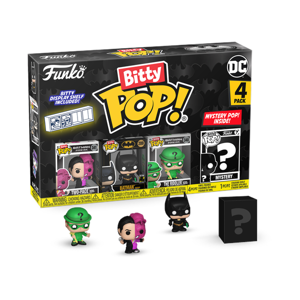 Your favorite Pops! have been shrunk into Bitty Pops!Expand your DC collection with this assortment of Bitty Pop! figures featuring your most beloved heroes and villains!This 4-pack includes Bitty Pop! Two-Face - Batman Forever, Bitty Pop! Batman - Forever, Bitty Pop! The Riddler - Batman Forever, and a mystery Bitty Pop! figure.The possible mystery Bitty Pops! are Hyper Rare (1/6) Batman - Justice League, Hyper Rare (1/6) Batman - Batman v Superman, Rare (1/3) The Joker - Batman 1989 (Makeup), and Rare (1/3) Mr. Freeze - Batman & Robin (Metallic).Bitty Pops! are packaged in hard acrylic cases with detachable bottom lids. Detachable bottom lids double as acrylic bases, to which the Bitty Pop! figures are adhered.Sort and arrange your Bitty Pops! with the included display case! Acrylic display cases are stackable and hold four Bitty Pop! figures each.Vinyl figures are approximately 0.9-inches tall.Four figures per single package purchase.Warning: Choking Hazard. Collectibles are small. Not for children under the age of 3 years old.Item selection is random, as each piece is in blind packaging.We cannot accept requests for specific items. You may receive duplicate figures.