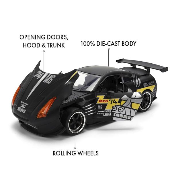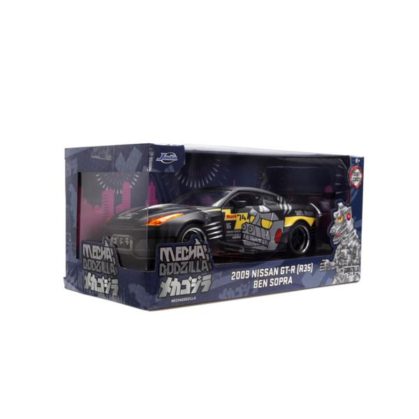 Experience the ultimate fusion of kaiju destruction and high-speed racing with the Jada Toys Anime Hollywood Rides Mechagodzilla 2009 Nissan GT-R R35 Ben Sopra V.2!This 1:24 scale die-cast model is inspired by Godzilla vs. Mechagodzilla (1974), featuring a bold Mechagodzilla-themed design with metallic silver paint, battle-inspired graphics, yellow-tinted headlights, and aggressive aerodynamic styling.The GT-R comes equipped with opening doors, hood, and trunk, showcasing a meticulously detailed engine bay and interior.This hobby edition is designed specifically for collectors who prefer a figure-free display, making it a sleek addition to any die-cast or Godzilla collection.Whether you're a JDM enthusiast, a kaiju fan, or a die-hard collector, this limited-edition piece is a must-have.Get yours before it disappears into the night!