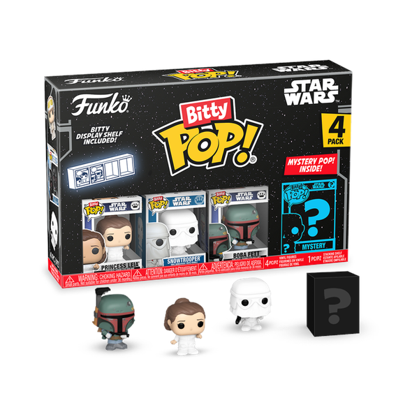 The world of POP! is getting bigger - and smaller - with Bitty POP! collectibles!Expand your Star Wars collection with this assortment of Bitty POP! collectibles featuring the most stellar characters in the galaxy!This 4-pack includes Bitty POP! Princess Leia, Bitty POP! Snowtrooper, Bitty POP! Boba Fett, and a mystery Bitty POP! figure.The possible mystery Bitty POP! collectibles are Hyper Rare (1/6) Han Solo in Carbonite, Hyper Rare (1/6) Bossk, Rare (1/3) Princess Leia (Bespin), and Rare (1/3) Han Solo (Hoth).Bitty POP! figures are packaged in hard acrylic cases with detachable bottom lids. Detachable bottom lids double as acrylic bases, to which the Bitty POP! figures are adhered.Sort and arrange your Bitty POP! collectibles with the included display case! Acrylic display cases are stackable and hold four Bitty POP! figures each.Vinyl collectibles are approximately 0.9-inches tall.Four collectibles per single package purchase.Warning: Choking Hazard. Collectibles are small.Not for children under the age of 3 years old.Item selection is random, as each piece is in blind packaging.We cannot accept requests for specific items.You may receive duplicate figures.