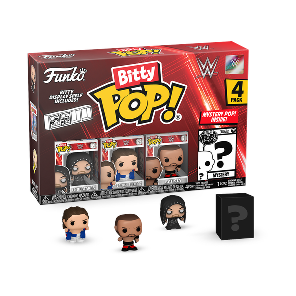 Your favorite WWE Pops! have been shrunk into Bitty Pops!Expand your collection with this assortment of Bitty Pop! figures featuring some of the most legendary names in WWE as miniaturized figures!This 4-pack includes Bitty Pop! Undertaker, Bitty Pop! British Bulldog, Bitty Pop! Batista, and a mystery Bitty Pop! figure. The possible mystery Bitty Pops! are Hyper Rare (1/6) Triple H (Skull King), Hyper Rare (1/6) Hulk Hogan, Rare (1/3) Dwayne "The Rock" Johnson, and Rare (1/3) "Stone Cold" Steve AustinBitty Pops! are packaged in hard acrylic cases with detachable bottom lids. Detachable bottom lids double as acrylic bases, to which the Bitty Pop! figures are adhered.Sort and arrange your Bitty Pops! with the included display case! Acrylic display cases are stackable and hold four Bitty Pop! figures each.Vinyl figures are approximately 0.9-inches tall.Four figures per single package purchase.Warning: Choking Hazard. Collectibles are small. Not for children under the age of 3 years old.Item selection is random, as each piece is in blind packaging. We cannot accept requests for specific items. You may receive duplicate figures.
