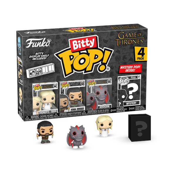 Your favorite Game of Thrones Pops! have been shrunk into Bitty Pops!Expand your collection with this assortment of Bitty Pop! figures featuring your most beloved heroes and villains as miniaturized figures!This 4-pack includes Bitty Pop! Daenerys Targaryen, Bitty Pop! Khal Drogo, Bitty Pop! Drogon, and a mystery Bitty Pop! figure.The possible mystery Bitty Pops! are Hyper Rare (1/6) Daenerys Targaryen (with dragon), Hyper Rare (1/6) Bran Stark, Rare (1/3) Viserion, and Rare (1/3) Rhaegal.Bitty Pops! are packaged in hard acrylic cases with detachable bottom lids. Detachable bottom lids double as acrylic bases, to which the Bitty Pop! figures are adhered.Sort and arrange your Bitty Pops! with the included display case! Acrylic display cases are stackable and hold four Bitty Pop! figures each.Vinyl figures are approximately 0.9-inches tall.Four figures per single package purchase.Warning: Choking Hazard. Collectibles are small.Not for children under the age of 3 years old.Item selection is random, as each piece is in blind packaging.We cannot accept requests for specific items.You may receive duplicate figures.