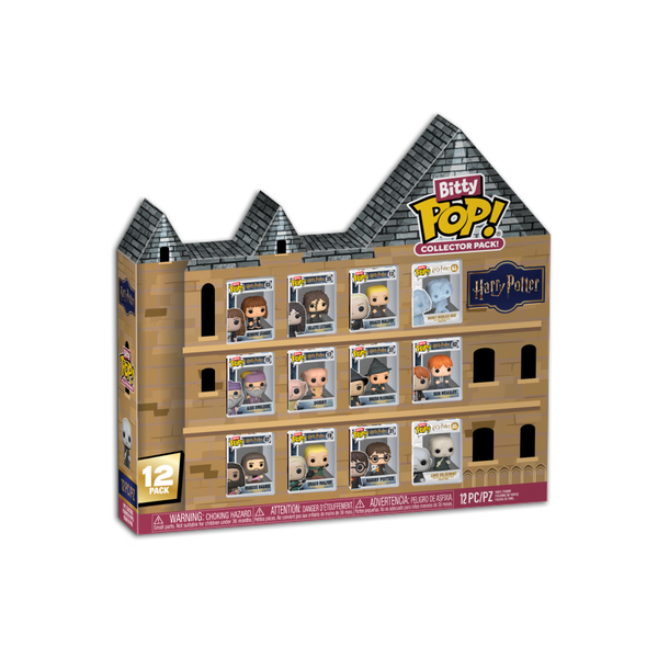 The world of POP! is getting bigger - and smaller - with Bitty POP! collectibles!Expand your Harry Potter collection with this Collector Pack featuring Hogwarts-themed packaging!This exclusive 12-pack includes Bitty POP! Hermione Granger, Bitty POP! Bellatrix Lestrange, Bitty POP! Draco Malfoy, Bitty POP! Nearly Headless Nick, Bitty POP! Albus Dumbledore, Bitty POP! Dobby, Bitty POP! Minerva McGonagall, Bitty POP! Ron Weasley, Bitty POP! Rubeus Hagrid, Bitty POP! Draco Malfoy - Quidditch, Bitty POP! Harry Potter, and Bitty POP! Voldemort.Bitty POP! collectibles are packaged in hard acrylic cases with detachable bottom lids. Detachable bottom lids double as acrylic bases, to which the Bitty POP! figures are adhered.Vinyl figures are approximately 0.9 in (2.3 cm) tall.Warning: Choking Hazard. Collectibles are small.Not for children under the age of 3 years old.