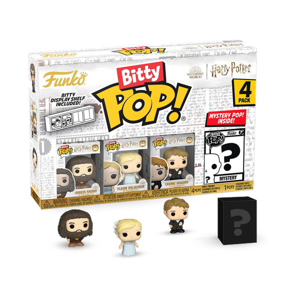 Diminuendo!Your favorite Harry Potter Pops! have been shrunk into Bitty Pops!Expand your Wizarding World collection with this assortment of Bitty Pop! figures featuring your most beloved Harry Potter characters!This 4-pack includes Bitty Pop! Rubeus Hagrid (Yule Ball), Bitty Pop! Fleur Delacour (Yule Ball), Bitty Pop! Cedric Diggory (Yule Ball), and a mystery Bitty Pop! figure.The possible mystery Bitty Pops! are Hyper Rare (1/6) Cedric Diggory (Triwizard Tournament), Hyper Rare (1/6) Rita Skeeter, Rare (1/3) Harry Potter (Triwizard Tournament), and Rare (1/3) Fleur Delacour (Triwizard Tournament).Bitty Pops! are packaged in hard acrylic cases with detachable bottom lids. Detachable bottom lids double as acrylic bases, to which the Bitty Pop! figures are adhered.Sort and arrange your Bitty Pops! with the included display case! Acrylic display cases are stackable and hold four Bitty Pop! figures each.Vinyl figures are approximately 0.9-inches tall.Four figures per single package purchase.Warning: Choking Hazard. Collectibles are small.Not for children under the age of 3 years old.Item selection is random, as each piece is in blind packaging. We cannot accept requests for specific items.You may receive duplicate figures.