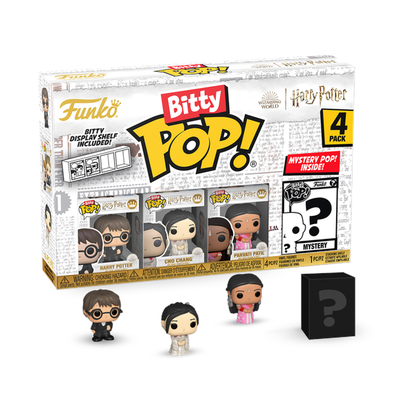 Diminuendo!Your favorite Harry Potter Pops! have been shrunk into Bitty Pops!Expand your Wizarding World collection with this assortment of Bitty Pop! figures featuring your most beloved Harry Potter characters!This 4-pack includes Bitty Pop! Harry Potter (Yule Ball), Bitty Pop! Cho Chang (Yule Ball), Bitty Pop! Parvati Patil (Yule Ball), and a mystery Bitty Pop! figure.The possible mystery Bitty Pops! are Hyper Rare (1/6) Cedric Diggory (Triwizard Tournament), Hyper Rare (1/6) Rita Skeeter, Rare (1/3) Harry Potter (Triwizard Tournament), and Rare (1/3) Fleur Delacour (Triwizard Tournament).Bitty Pops! are packaged in hard acrylic cases with detachable bottom lids. Detachable bottom lids double as acrylic bases, to which the Bitty Pop! figures are adhered.Sort and arrange your Bitty Pops! with the included display case! Acrylic display cases are stackable and hold four Bitty Pop! figures each.Vinyl figures are approximately 0.9-inches tall.Four figures per single package purchase.Warning: Choking Hazard. Collectibles are small.Not for children under the age of 3 years old.Item selection is random, as each piece is in blind packaging. We cannot accept requests for specific items.You may receive duplicate figures.
