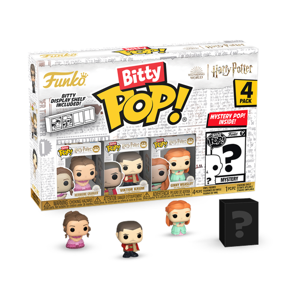 Diminuendo!Your favorite Harry Potter Pops! have been shrunk into Bitty Pops!Expand your Wizarding World collection with this assortment of Bitty Pop! figures featuring your most beloved Harry Potter characters!This 4-pack includes Bitty Pop! Hermione Granger (Yule Ball), Bitty Pop! Viktor Krum (Yule Ball), Bitty Pop! Ginny Weasley (Yule Ball), and a mystery Bitty Pop! figure.The possible mystery Bitty Pops! are Hyper Rare (1/6) Cedric Diggory (Triwizard Tournament), Hyper Rare (1/6) Rita Skeeter, Rare (1/3) Harry Potter (Triwizard Tournament), and Rare (1/3) Fleur Delacour (Triwizard Tournament).Bitty Pops! are packaged in hard acrylic cases with detachable bottom lids. Detachable bottom lids double as acrylic bases, to which the Bitty Pop! figures are adhered.Sort and arrange your Bitty Pops! with the included display case! Acrylic display cases are stackable and hold four Bitty Pop! figures eachVinyl figures are approximately 0.9-inches tall.Four figures per single package purchase.Warning: Choking Hazard. Collectibles are small.Not for children under the age of 3 years old.Item selection is random, as each piece is in blind packaging. We cannot accept requests for specific items.You may receive duplicate figures.