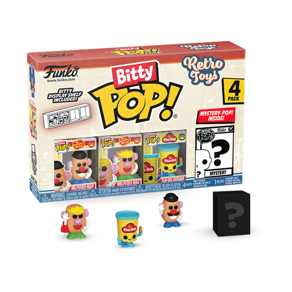 Your favorite Retro Toy Pops! have been shrunk into Bitty Pops!Expand your collection with this assortment of Bitty Pop! figures featuring your most beloved toys as miniaturized figures!This 4-pack includes Bitty Pop! Mr. Potato Head, Bitty Pop! Mrs. Potato Head, Bitty Pop! Play-Doh Container and a mystery Bitty Pop! figure.The possible mystery Bitty Pops! are Hyper Rare (1/6) Soundwave, Hyper Rare (1/6) Dr. Mindbender (chase), Rare (1/3) Cavity Sam, and Rare (1/3) Lite-Brite.Bitty Pops! are packaged in hard acrylic cases with detachable bottom lids. Detachable bottom lids double as acrylic bases, to which the Bitty Pop! figures are adhered.Sort and arrange your Bitty Pops! with the included display case! Acrylic display cases are stackable and hold four Bitty Pop! figures each.Vinyl figures are approximately 0.9-inches tall.Four figures per single package purchase.Warning: Choking Hazard. Collectibles are small.Not for children under the age of 3 years old.Item selection is random, as each piece is in blind packaging.We cannot accept requests for specific items. You may receive duplicate figures.