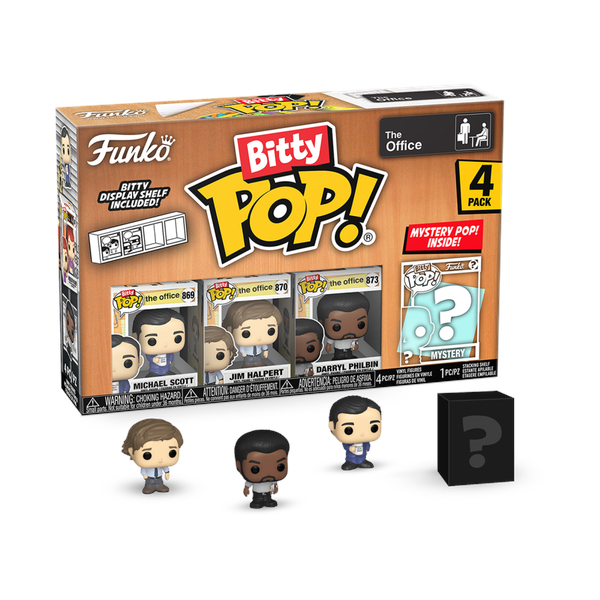 Your favorite The Office Pops! have been shrunk into Bitty Pops!Expand your collection with this assortment of Bitty Pop! figures featuring your most beloved Dunder Mifflin coworkers as miniaturized figures!This 4-pack includes Bitty Pop! Michael Scott, Bitty Pop! Jim Halpert, Bitty Pop! Darryl Philbin, and a mystery Bitty Pop! figure.The possible mystery Bitty Pops! are Hyper Rare (1/6) Jan Levinson, Hyper Rare (1/6) Kevin Malone (superhero), Rare (1/3) Kevin Malone with chili, and Rare (1/3) Kelly Kapoor.Bitty Pops! are packaged in hard acrylic cases with detachable bottom lids. Detachable bottom lids double as acrylic bases, to which the Bitty Pop! figures are adhered.Sort and arrange your Bitty Pops! with the included display case! Acrylic display cases are stackable and hold four Bitty Pop! figures each.Vinyl figures are approximately 0.9-inches tall.Four figures per single package purchase.Warning: Choking Hazard. Collectibles are small. Not for children under the age of 3 years old.Item selection is random, as each piece is in blind packaging.We cannot accept requests for specific items. You may receive duplicate figures.