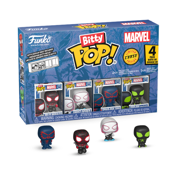 The world of POP! is getting bigger - and smaller - with Bitty POP! collectibles!Expand your Marvel collection with this 4-pack featuring Bitty POP! Miles Morales, Bitty POP! Ghost-Spider, Bitty POP! Spider-Man 2099, and a chase Bitty POP! collectible.The possible chase Bitty POP! collectibles are Rare (1/3) Spider-Man – Stealth Suit, Rare (1/3) Spider-Man – Symbiote Suit, Hyper Rare (1/6) Peter Parker, and Hyper Rare (1/6) Spider-Man – Spotlight.Bitty POP! collectibles are packaged in hard acrylic cases with detachable bottom lids. The detachable bottom lids double as acrylic bases, to which the Bitty POP! collectibles are adhered.Sort and arrange your Bitty POP! collectibles with the included display case! Acrylic display cases are stackable and hold four Bitty POP! collectibles each.Vinyl figures are approximately 0.9 in (2.3 cm) tall.Four collectibles per single package purchase.Warning: Choking Hazard. Collectibles are small.Not for children under the age of 3 years old.Chase variants are shipped at random. We cannot accept requests for specific items.You may receive duplicate collectibles.