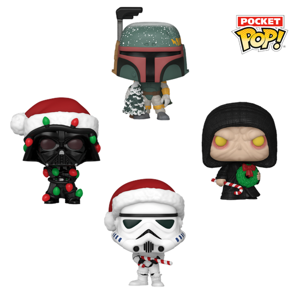 Stuff your stockings with the Star Wars Pocket Pop! Holiday Box!This 4-pack features Pocket Pop! Darth Vader, Pocket Pop! Emperor Palpatine, Pocket Pop! Boba Fett, and Pocket Pop! Stormtrooper, all in adorable, holiday-themed ensembles.All four Pocket Pops! come in a festive, tree-shaped box.This Holiday Box set will make the perfect gift for loved ones - or for yourself!Make room for the Dark Side in your Star Wars collection with this Pocket Pop! Holiday Box set!Vinyl figures are approximately 1.8-inches tall.