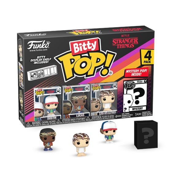 Your favorite Stranger Things Pops! have been shrunk into Bitty Pops!Expand your collection with this assortment of Bitty Pop! figures featuring your most beloved heroes and monsters as miniaturized figures!This 4-pack includes Bitty Pop! Dustin, Bitty Pop! Lucas, Bitty Pop! Eleven (with Electrodes), and a mystery Bitty Pop! figure.The possible mystery Bitty Pops! are Hyper Rare (1/6) Upside Down Barb, Hyper Rare (1/6) Eleven Underwater, Rare (1/3) Upside Down Will, and Rare (1/3) Eleven with Eggos and Wig.Bitty Pops! are packaged in hard acrylic cases with detachable bottom lids. Detachable bottom lids double as acrylic bases, to which the Bitty Pop! figures are adhered.Sort and arrange your Bitty Pops! with the included display case! Acrylic display cases are stackable and hold four Bitty Pop! figures each.Vinyl figures are approximately 0.9-inches tall.Four figures per single package purchase.Warning: Choking Hazard. Collectibles are small.Not for children under the age of 3 years old.Item selection is random, as each piece is in blind packaging. We cannot accept requests for specific items.You may receive duplicate figures.