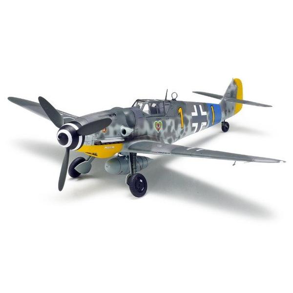 This is a Tamiya model replica of the Messerschmitt Bf109, which was the most prolifically manufactured fighter in history; of its variants, the G-6 was the most numerous at 13,000 aircraft. In response to improving Allied foes in the air, Bf109 G aircraft had the more powerful DB605 engine, and from the G-6 were equipped with dual 13mm MG131 machine guns that required the distinctive bulges on either side of the cockpit cowling known as Beule." Some were even given a 20mm cannon gondola under each wing for further improved firepower. The Bf109 G-6 was deployed on both the Western and Eastern fronts