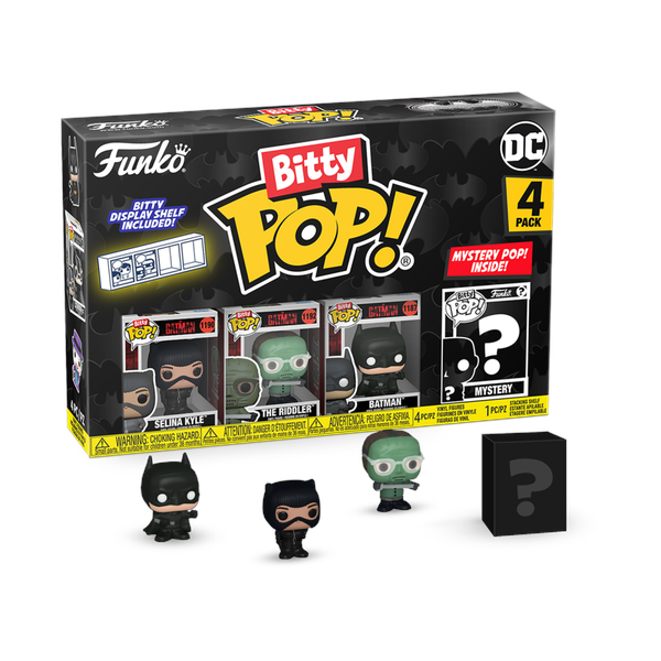 Your favorite Pops! have been shrunk into Bitty Pops!Expand your DC collection with this assortment of Bitty Pop! figures featuring your most beloved heroes and villains!This 4-pack includes Bitty Pop! Selina Kyle - The Batman, Bitty Pop! The Riddler - The Batman, Bitty Pop! Batman - The Batman, and a mystery Bitty Pop! figure.The possible mystery Bitty Pops! are Hyper Rare (1/6) Batman - Justice League, Hyper Rare (1/6) Batman - Batman v Superman, Rare (1/3) The Joker - Batman 1989 (Makeup), and Rare (1/3) Mr. Freeze - Batman & Robin (Metallic).Bitty Pops! are packaged in hard acrylic cases with detachable bottom lids. Detachable bottom lids double as acrylic bases, to which the Bitty Pop! figures are adhered.Sort and arrange your Bitty Pops! with the included display case! Acrylic display cases are stackable and hold four Bitty Pop! figures each.Vinyl figures are approximately 0.9-inches tall.Four figures per single package purchase.Warning: Choking Hazard. Collectibles are small. Not for children under the age of 3 years old.Item selection is random, as each piece is in blind packaging.We cannot accept requests for specific items. You may receive duplicate figures.