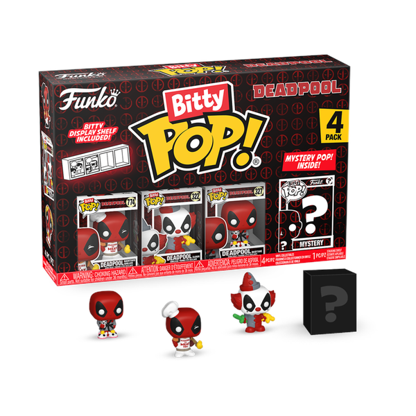 Your favourite merc with a mouth Pops! have been shrunk into Bitty Pops! Expand your Deadpool collection with this assortment of Bitty Pop! figures featuring the most iconic anti-hero around!This 4-pack includes Bitty Pop! Deadpool (Backyard Griller), Bitty Pop! Deadpool (Clown), Bitty Pop! Deadpool (Bedtime), and a mystery Bitty Pop! figure. The possible mystery Bitty Pops! are Rare (1/3) Deadpool (Lederhosen), Rare (1/3) Deadpool (Beauty Pageant), Hyper Rare (1/6) Deadpool (Tourist), and Hyper Rare (1/6) Deadpool (French Maid).Bitty Pops! are packaged in hard acrylic cases with detachable bottom lids. Detachable bottom lids double as acrylic bases, to which the Bitty Pop! figures are adhered.Sort and arrange your Bitty Pops! with the included display case! Acrylic display cases are stackable and hold four Bitty Pop! figures each.Vinyl collectibles are approximately 0.9-inches tall.Four figures per single package purchase. Warning: Choking Hazard. Collectibles are small.Not for children under the age of 3 years old.Item selection is random, as each piece is in blind packaging.We cannot accept requests for specific items. You may receive duplicate figures.