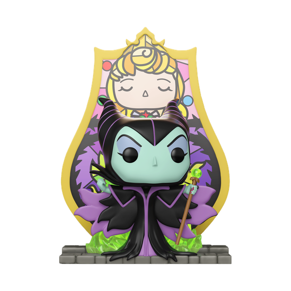 Summon dark forces to your collection with POP! Deluxe Maleficent!This Mistress of All Evil is framed by a stunning stained glass-inspired background, which features POP! Aurora and more details from Disney's Sleeping Beauty.Shine a light through the window to enhance the beauty of the stained-glass background!Vinyl figure is approximately 6.6 in (16.8 cm) tall.