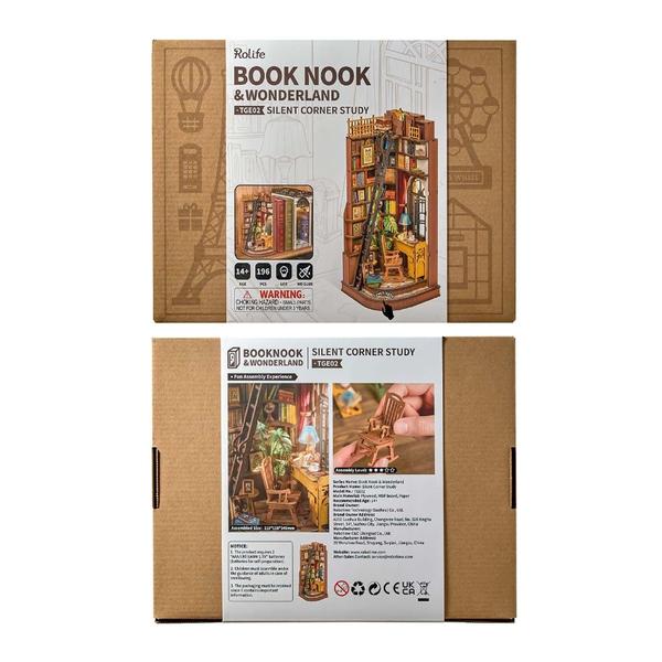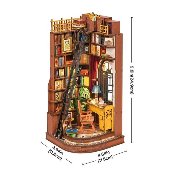 Discover the warmth of this unique place. The Rolife silent corner desk is your personal retreat, a cozy reading space that captures the magic of old-fashioned bookstores and family libraries. Immerse yourself in this little world and let yourself be carried away by creativity and freedom. With its vintage desk, charming lamp, and cup of your favorite beverage, your comfortable rocking chair is ready to welcome you for a few hours while you build this DIY shelf unit. This little corner is cleverly used, with books stacked high on each shelf. Each volume is accessible via a tall ladder, and the space is well ventilated thanks to the French window adorned with a classic red curtain. The puzzle itself is an easy and relaxing construction, further highlighting the soothing hobby that Rolife promotes.