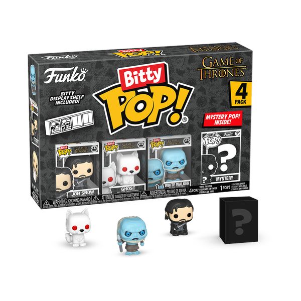 Your favorite Game of Thrones Pops! have been shrunk into Bitty Pops!Expand your collection with this assortment of Bitty Pop! figures featuring your most beloved heroes and villains as miniaturized figures!This 4-pack includes Bitty Pop! Jon Snow, Bitty Pop! Ghost, Bitty Pop! White Walker, and a mystery Bitty Pop! figure.The possible mystery Bitty Pops! are Hyper Rare (1/6) Daenerys Targaryen (with dragon), Hyper Rare (1/6) Bran Stark, Rare (1/3) Viserion, and Rare (1/3) Rhaegal.Bitty Pops! are packaged in hard acrylic cases with detachable bottom lids. Detachable bottom lids double as acrylic bases, to which the Bitty Pop! figures are adhered.Sort and arrange your Bitty Pops! with the included display case! Acrylic display cases are stackable and hold four Bitty Pop! figures each.Vinyl figures are approximately 0.9-inches tall.Four figures per single package purchase.Warning: Choking Hazard. Collectibles are small.Not for children under the age of 3 years old.Item selection is random, as each piece is in blind packaging.We cannot accept requests for specific items.You may receive duplicate figures.