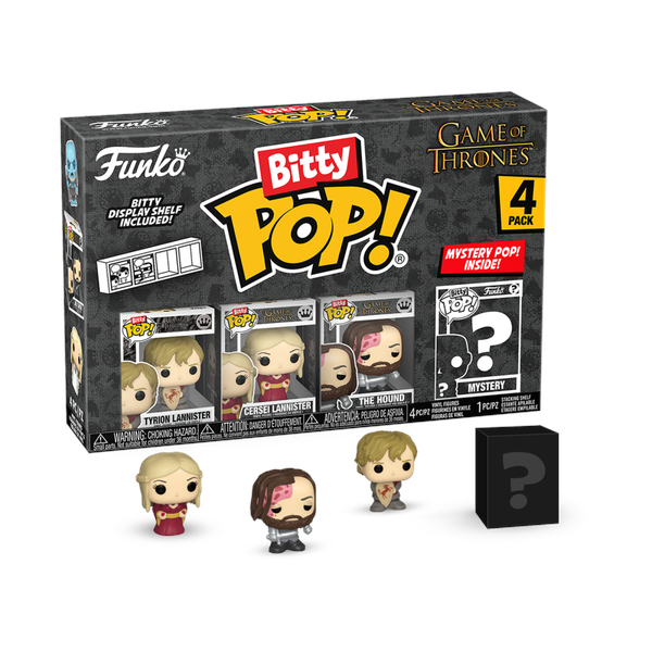 Your favorite Game of Thrones Pops! have been shrunk into Bitty Pops!Expand your collection with this assortment of Bitty Pop! figures featuring your most beloved heroes and villains as miniaturized figures!This 4-pack includes Bitty Pop! Tyrion Lannister, Bitty Pop! Cersei Lannister, Bitty Pop! The Hound, and a mystery Bitty Pop! figure.The possible mystery Bitty Pops! are Hyper Rare (1/6) Daenerys Targaryen (with dragon), Hyper Rare (1/6) Bran Stark, Rare (1/3) Viserion, and Rare (1/3) Rhaegal.Bitty Pops! are packaged in hard acrylic cases with detachable bottom lids. Detachable bottom lids double as acrylic bases, to which the Bitty Pop! figures are adhered.Sort and arrange your Bitty Pops! with the included display case! Acrylic display cases are stackable and hold four Bitty Pop! figures each.Vinyl figures are approximately 0.9-inches tall.Four figures per single package purchase.Warning: Choking Hazard. Collectibles are small.Not for children under the age of 3 years old.Item selection is random, as each piece is in blind packaging.We cannot accept requests for specific items.You may receive duplicate figures.