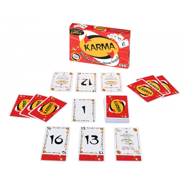 In Karma, each player is dealt three face-down cards that he cannot look at and that remain on the table in front of him. He is dealt six more cards, chooses three of those for his hand, and places the remaining three face-up onto his table cards in three separate stacks. One player begins by placing a card or cards of the same value from his hand onto the table face-up to create a discard pile. The other players in turn must place onto the discard stack a card or cards of the same value that match(es) or exceed(s) the value of the top card of the stack; or else, pick up the stack. Until the draw pile is gone, players must draw at the end of their turns to maintain a hand of at least three cards.