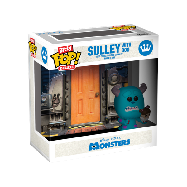 Expand your Disney Pixar's Monsters Inc. collection with this exclusive Bitty POP! Deluxe Sulley with Boo!Packaged in a hard acrylic display case, this Bitty POP! Sulley with Boo stands out against a matching backdrop of a Scare Floor door!The Bitty POP! figure is adhered to an acrylic base that can be removed from the display case. The display case also includes an extra space for you to add another of your favorite Bitty POP! characters to the scene!Mix and match for endless combinations!Vinyl figure is approximately 0.9-inches tall.Acrylic display case is approximately 2.5" W x 2.4" H x 1.25" D.One figure per single package purchase.Warning: Choking Hazard. Collectibles are small.Not for children under the age of 3 years old.
