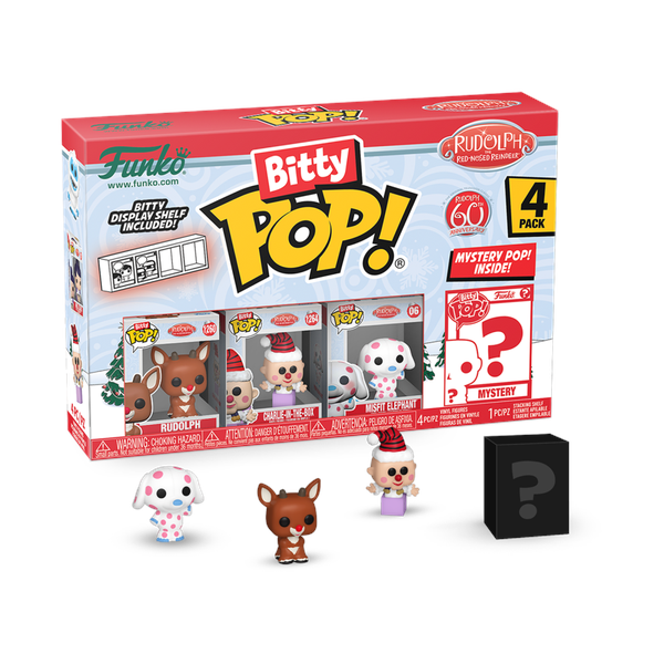 Your favorite Rudolph the Red-Nosed Reindeer Pops! have been shrunk into Bitty Pops!Expand your holiday collection with this assortment of Bitty Pop! figures featuring your most beloved Rudolph the Red-Nosed Reindeer characters!This 4-pack includes Bitty Pop! Rudolph, Bitty Pop! Charlie-in-the-Box, Bitty Pop! Misfit Elephant, and a mystery Bitty Pop! figure.The possible mystery Bitty Pops! are Rare (1/3) Santa Claus (Jingle Jingle Jingle), Rare (1/3) Hermey (Dentist), Hyper Rare (1/6) King Moonracer, and Hyper Rare (1/6) Sam the Snowman.Bitty Pops! are packaged in hard acrylic cases with detachable bottom lids. Detachable bottom lids double as acrylic bases, to which the Bitty Pop! figures are adhered.Sort and arrange your Bitty Pops! with the included display case! Acrylic display cases are stackable and hold four Bitty Pop! figures each.Vinyl figures are approximately 0.9-inches tall.Four figures per single package purchase.Warning: Choking Hazard. Collectibles are small. Not for children under the age of 3 years old.Item selection is random, as each piece is in blind packaging.We cannot accept requests for specific items. You may receive duplicate figures.
